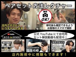 SENSEではご自宅での再現性にこだわり、ご自身で簡単にセットできるヘアスタイルを常に意識しております。乾かすだけで整ったり、WAXで簡単にセットできるように、毛質や髪のクセを意識したカットや刈り上げ、パーマのツイスト具合を丁寧に調整しております。また最後に、セットのコツや方法などもご説明させて頂いております。お気軽にお越しください。
