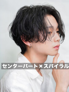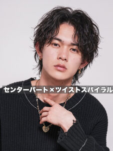 ツイストスパイラルは、スパイラルのカールに“ねじり”が加わるので、束感と無造作感が強く出るセンターパートです。髪が柔らかくて動きが出にくい人でも、簡単に立体感が出ます。